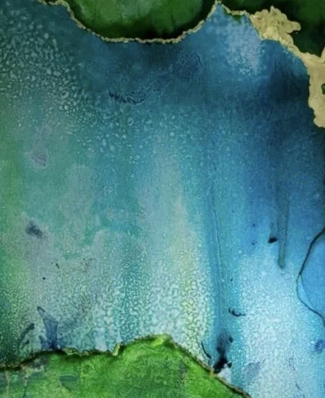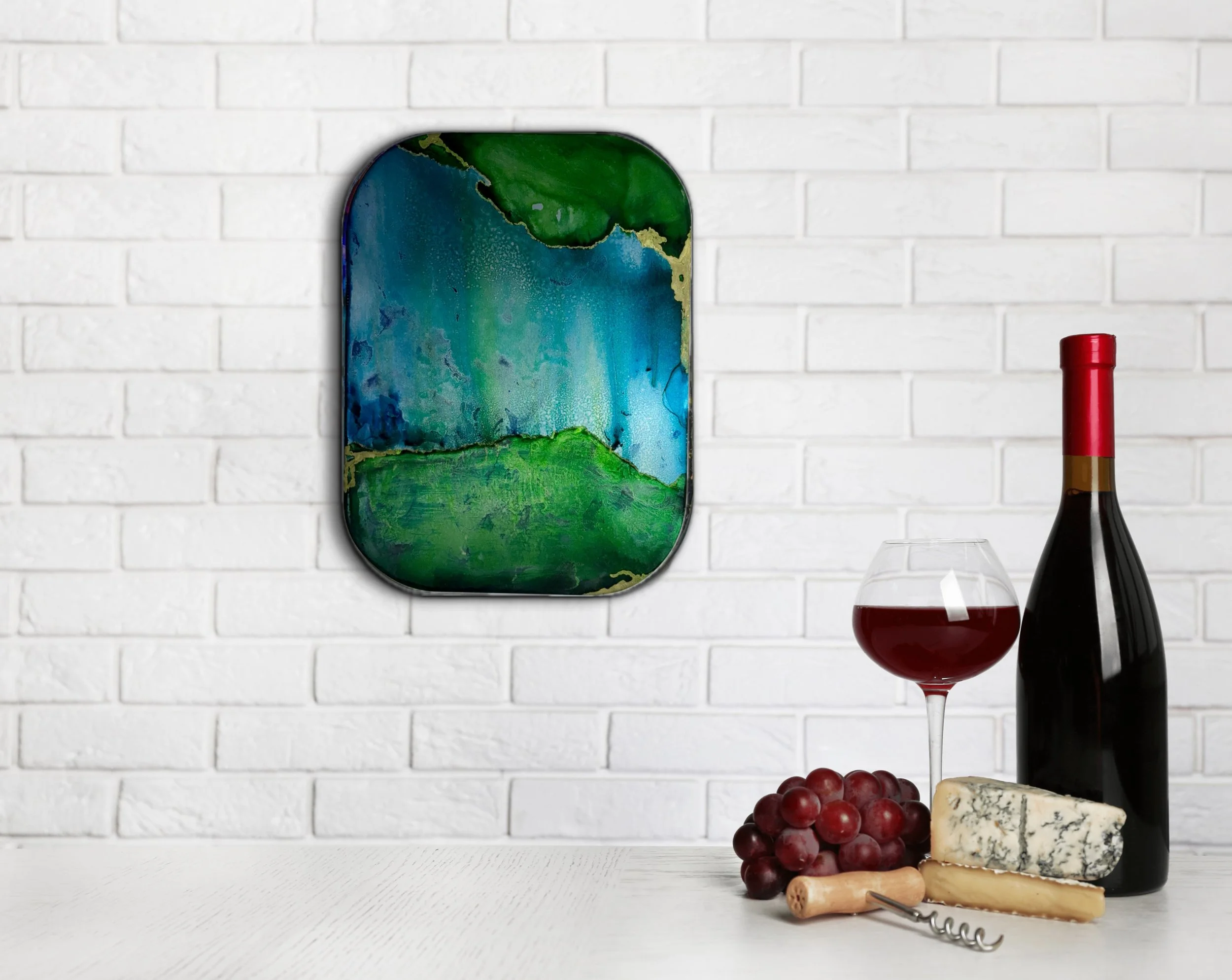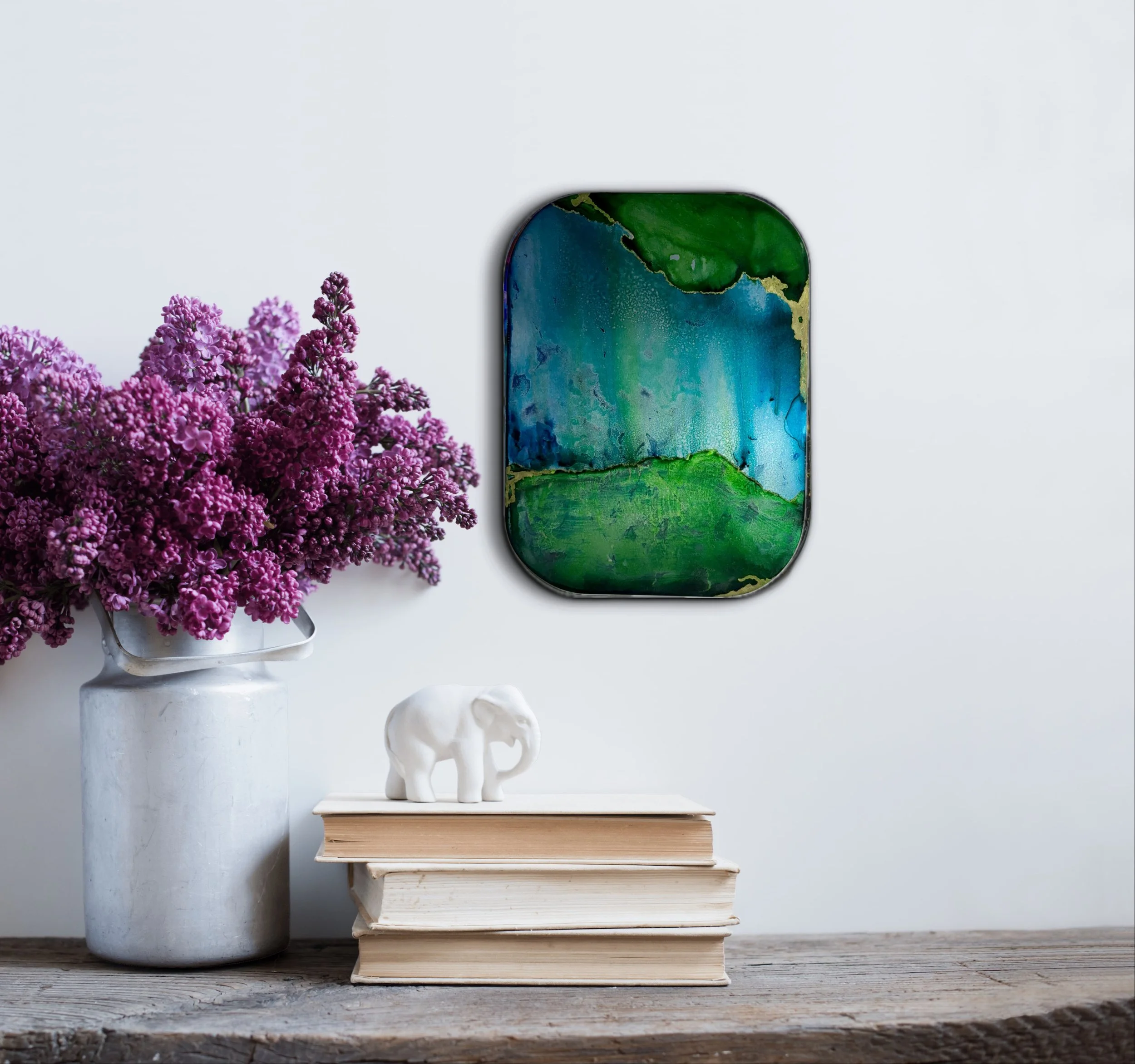 Aqua Inlet is inspired by a memory from flight, the meeting of land and water seen from high above. Painted on aluminum, shaped to the dimensions of a passenger window, it reflects the materials and views that defined my years in the air. Calm blues and soft greens capture a fleeting moment of stillness, where the world below feels both distant and deeply familiar.